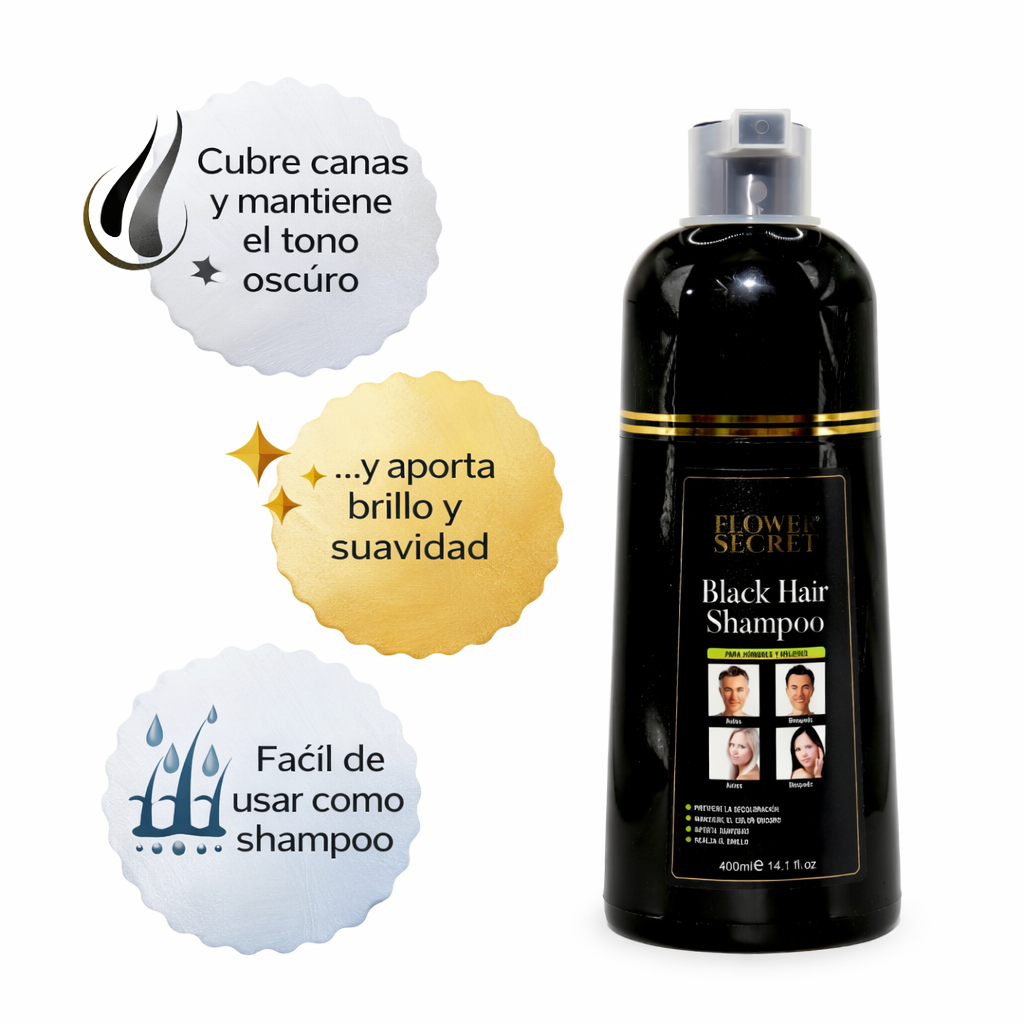 Flower Secret Black Hair Shampoo está pensado para quienes quieren cubrir canas y mantener un tono oscuro de forma práctica, en casa, con una rutina simple tipo lavado. Ideal para mujeres y hombres que buscan una opción que se sienta más amable con el cabello, especialmente si ya vienes de tintes que resecan o procesos que estresan.